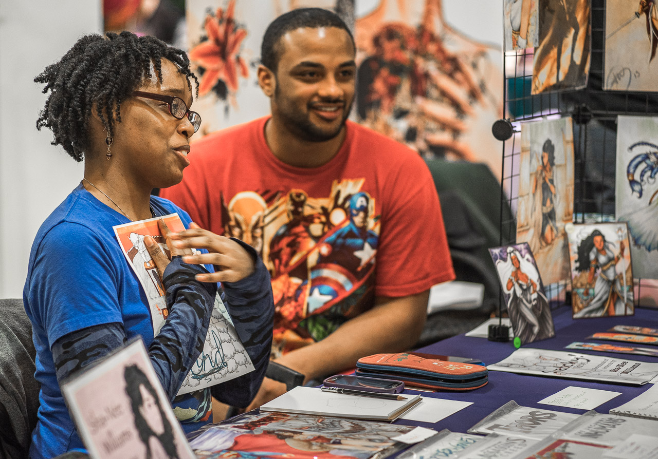 My daughter likes to write comics. One weekend we stopped by a comic art show at a library in the Bronx. She had just given a copy of her comic to an artist at the show presenting her work.